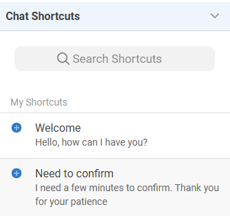 The Chat Shortcut Widget enables users to easily search and see all of their global and personal chat shortcuts. The user can quickly add to the message by tapping the selected shortcut. The chat shortcut displays the first line of text and users can hover over a shortcut to expand the visible text. Similar to other Widgets, users can select which Widgets are visible and the order they are presented in Settings > Communication Center > Widgets.