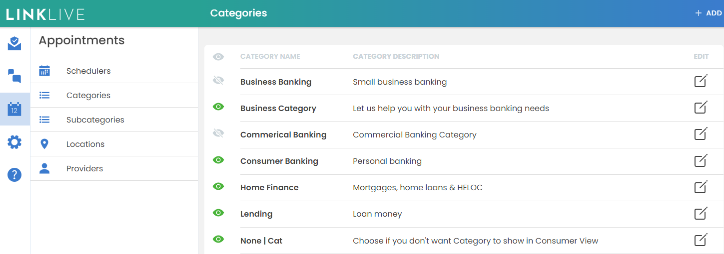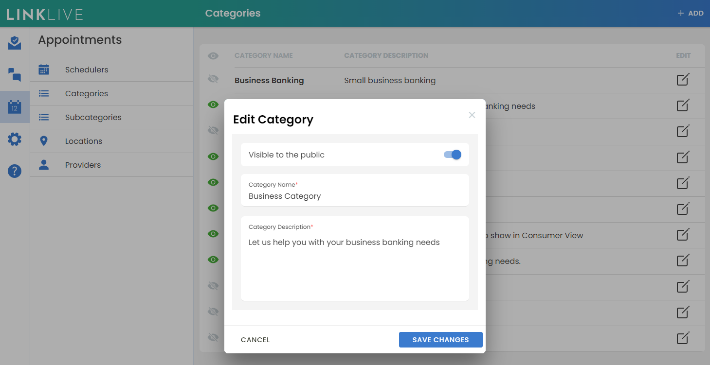 Appointment Managers will manage Categories, Sub-categories and Locations from the Appointments icon in left hand navigation bar of LinkLive or LinkLive Mobile. Clicking on the link displays the list of objects that have been added. Clicking the Add button in upper right will add new objects. Red asterisks indicate mandatory fields. Users will add the data and click ADD to save. Note that when an object is updated, the new data is instantly visible in any new or existing Guest Views that use this object. This is a powerful feature for managing your Guest Views. For example, if a location’s address or phone number changes or if the name of a product or service changes, you can update the data once and it automatically propagates to all guest views that use that object.