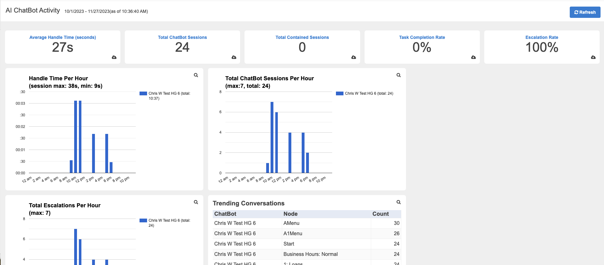 The AI ChatBot Activity dashboard can be accessed from the Menu drop-down under the Dashboards category. This dashboard display important detail about all chatbots deployed across hunt groups. Metrics respond to hunt groups filters to drill into specific hunt group performance.
