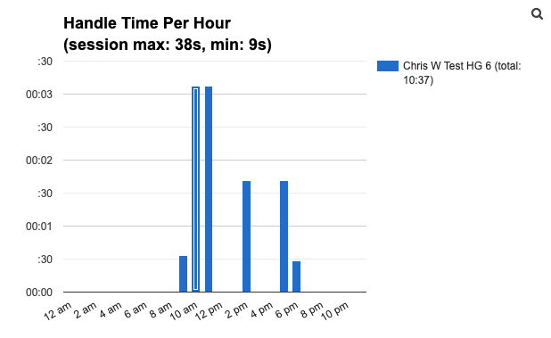 Bar chart showing the average handle time of sessions occurring over the selected time period. Note that the legend dynamically shifts in granularity. In the example below, it shows 30 seconds, 1 minute, 1 minute and 30 seconds, etc