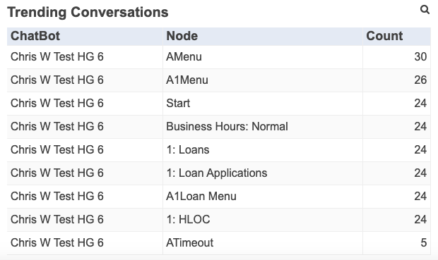 This widget displays the trending interactions within the select hunt group chatbots over the time period specified. This is useful in determining the nodes that users are interacting with most frequently that might be candidates for optimization.