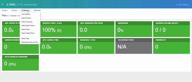 Users can filter reports in LinkLive Reporting by Agent Teams. To filter by Agent Teams, click on Agent Teams from the Options menu.
