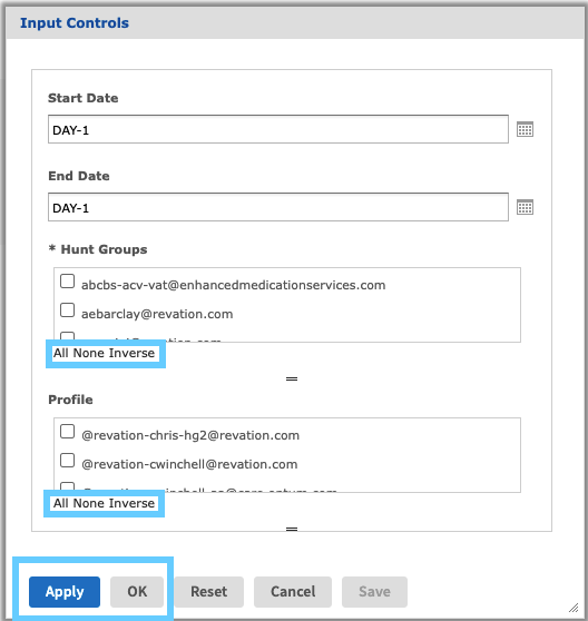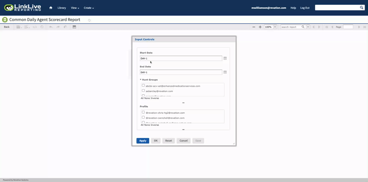 Set the desired filter parameters with the input control. The Start Date and End Date can be generated as relative dates to today or specific dates by using DAY-X or clicking the calendar control to select a specific date.