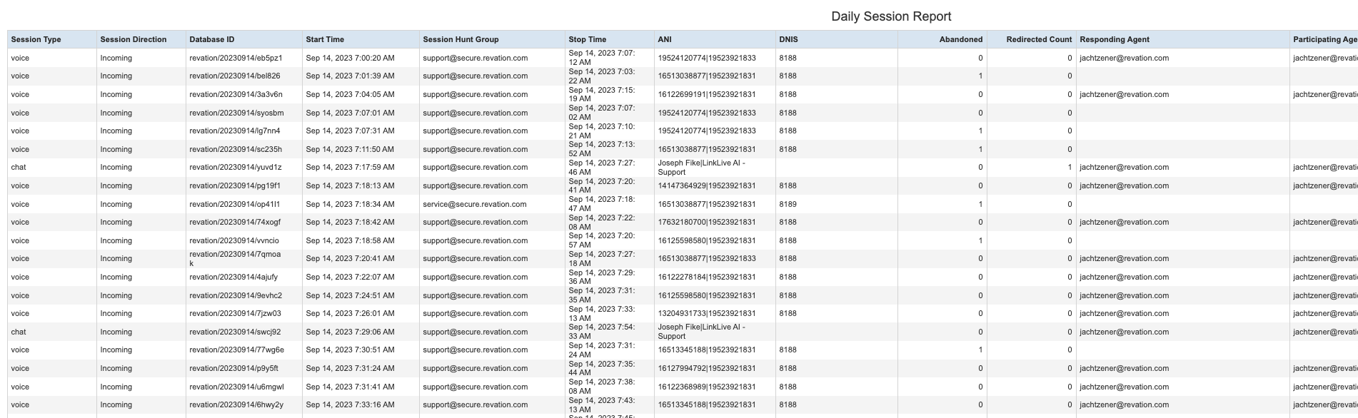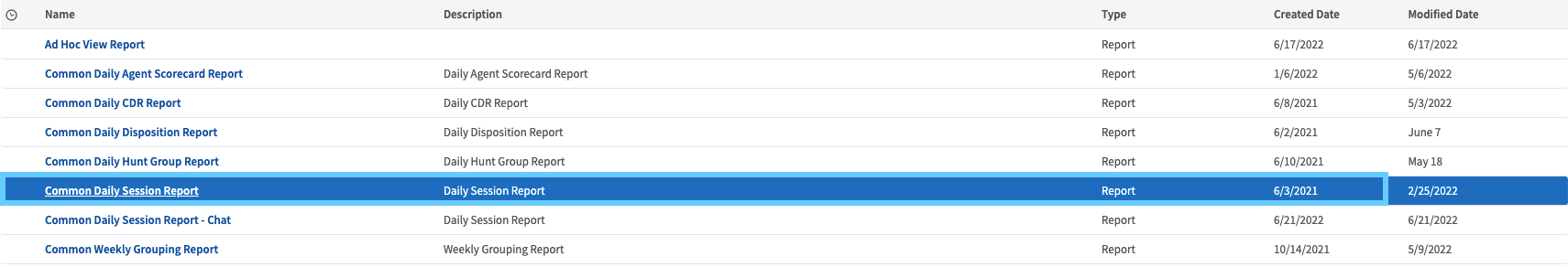 The Common Daily Session Report displays detailed session information for all hunt groups for the previous day. Review Reports for a detailed overview of filter, export, and input control information.