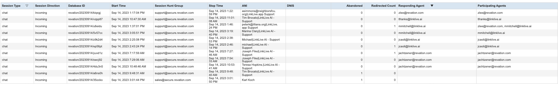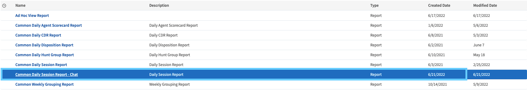 The Common Daily Session Report - Chat displays detailed session information for chat usage within your huntgroups. The default view looks to yesterday. Review Reports for a detailed overview of filter, export, and input control information.