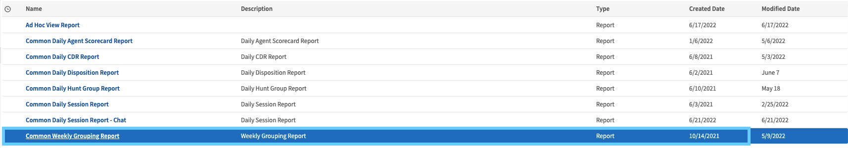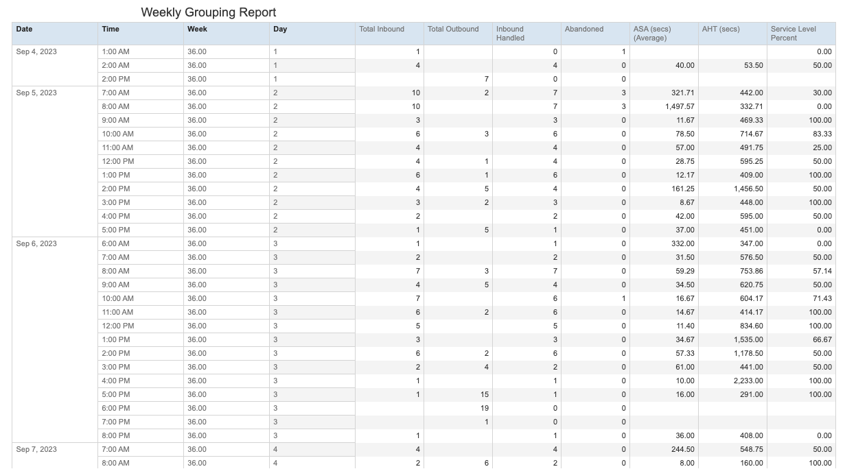 The Common Weekly Group Report displays summary hunt group metrics for the prior week by hour. Only time blocks where usage occurred will display. Review Reports for a detailed overview of filter, export, and input control information.