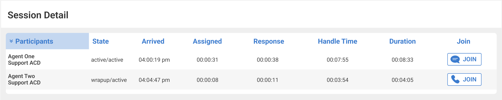 The main portion of LinkLive Reporting shows the list of active sessions for the Hunt Group. If there are no active sessions, this area will be blank. Data about any active sessions are shown on the console, including participants, caller information, response time, and duration of session. To join an active session as a supervisor, click on the “Join Session” button next to the desired session. The icon next to the “Join Session” button indicates the type of session. In the image below, the first session is an active web chat and the second session is an active voice call.