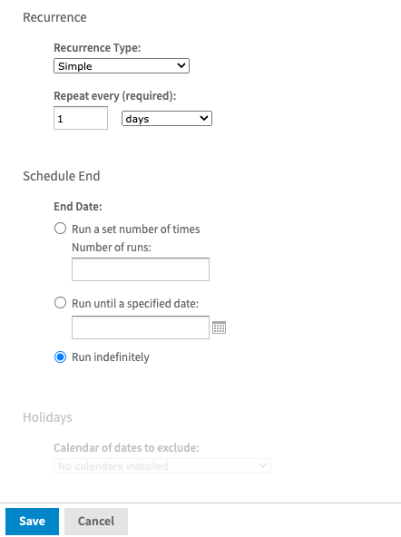 This option supports immediate and deferred start dates and allows for selection of when the report should repeat and any end date that would be required.