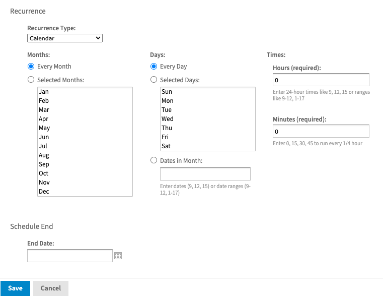 This is a more complex configuration that allows for specifying specific months, days, and times for the report to run. You can also specify the end date just like in the simple configuration.