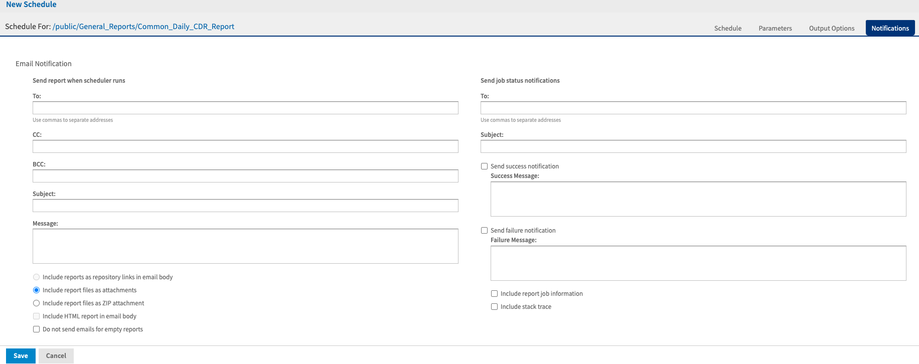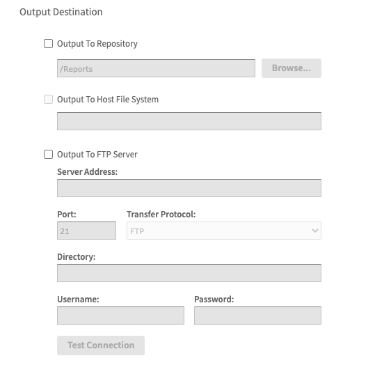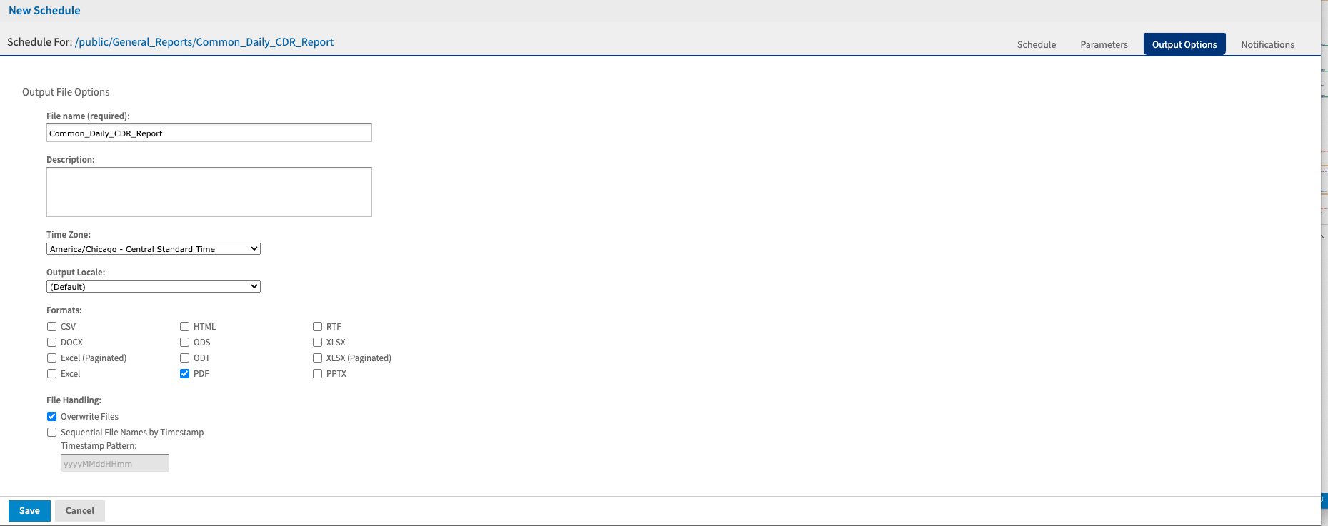 During the scheduling process, you are able to configure various output options that will be used in the generation of your selected report. You can specify the output format, naming conventions and output destination.