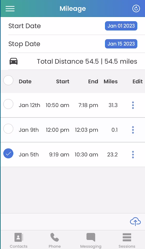Three dots for individual days allow you to view the map or edit miles.