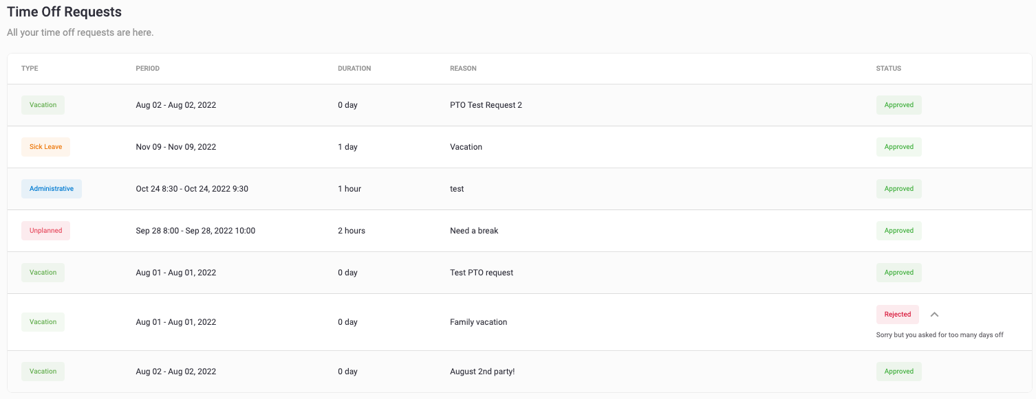 The status of the time off request. If a request is rejected, you will also see the for the rejection.