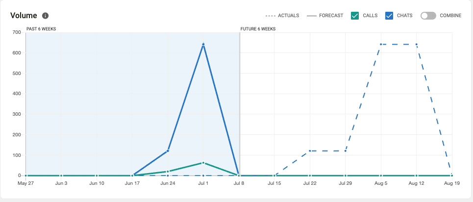 The Volume chart shows actual volume usage for both calls and chats. The dotted line represents the forecasted volume used to generate scheduling for that particular week.