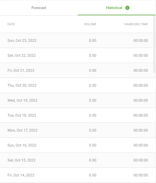 This tabular view provides visibility into call and chat volume by day. Using this insight, you can view forecasted volume amounts by day and historical volume amounts since inception.