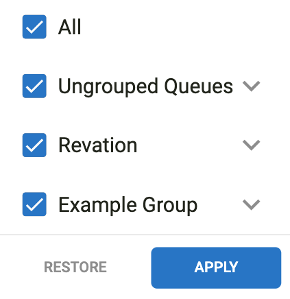 The Group & Queue filter is used to quickly filter all chats and table down to your queue of focus. To limit your view to one or more queues, click the Group & Queue filter in the top right, select one or more queues, and click Apply.