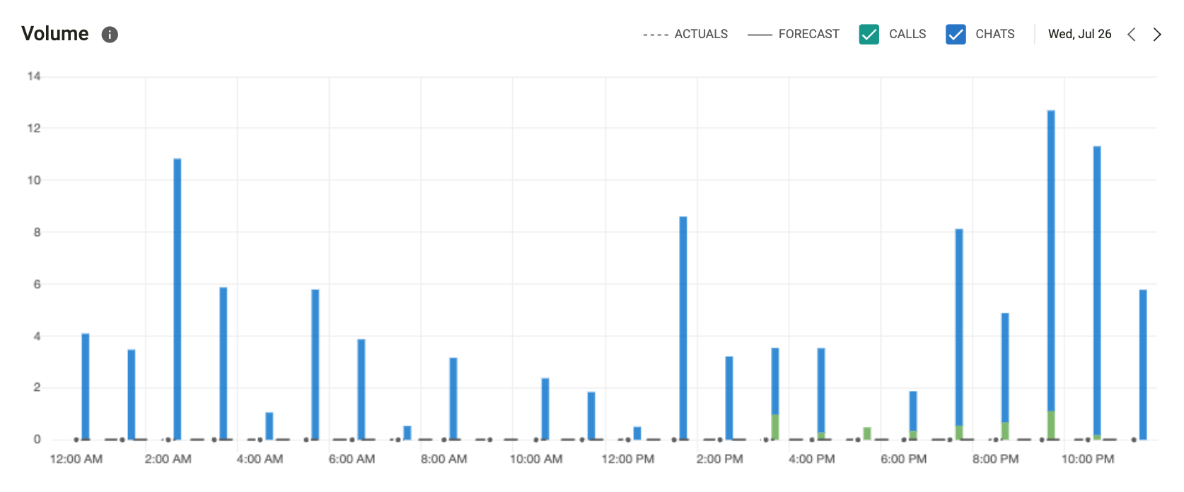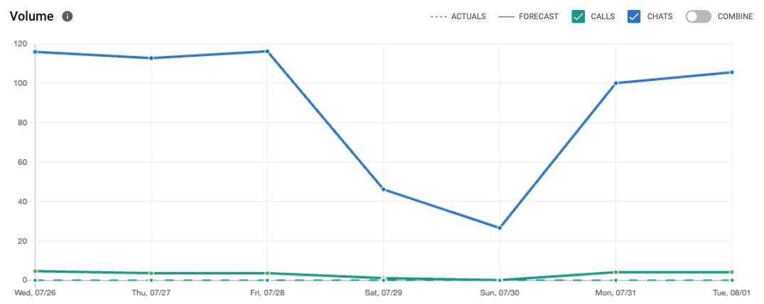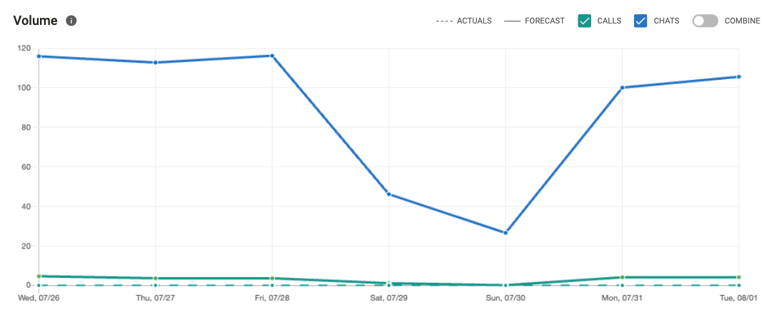 Supervisors can review historical, current, and future volume data using the volume graph. Information is broken down by calls and chats. Currently, you are able to view forecasted volumes one week into the future for resource planning.