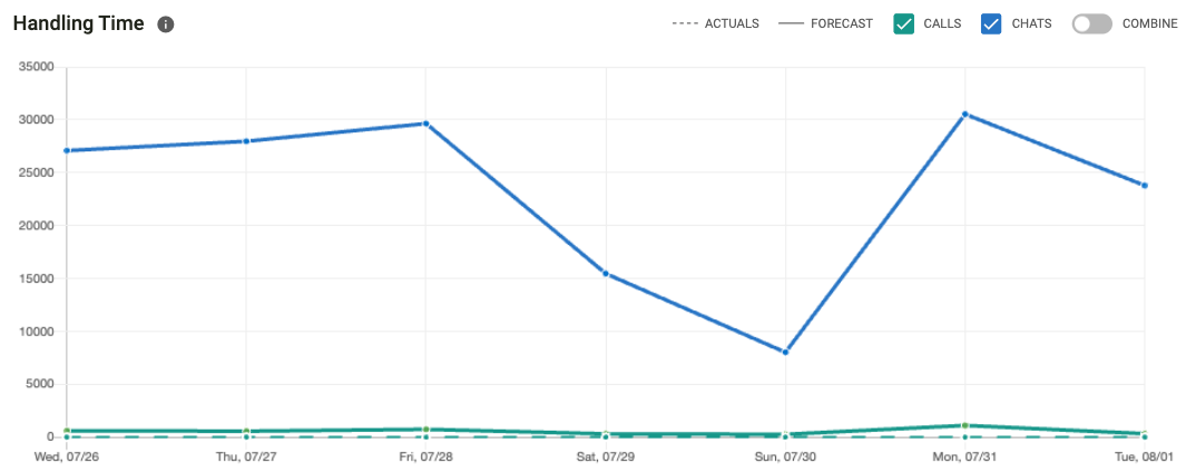 The Handling Time chart shows average handle times for calls and chats by day for a particular week or day depending the filters applied. The dotted line represents the forecasted handling time for voice and chat.