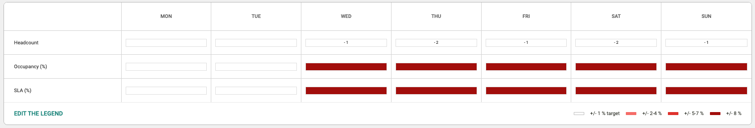 The schedule guide at the top of the scheduling tool provides quick visibility into overall contact center health from a scheduling perspective. A supervisor can quickly see SLA, Headcount, and Occupancy %.