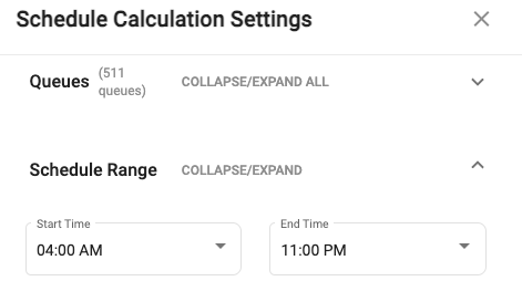 Available through the schedule configuration gear, selecting a schedule range will update the interface to display the selected schedule block going forward. This is a useful feature for 9-5 contact centers not looking to support 24-hour operations.