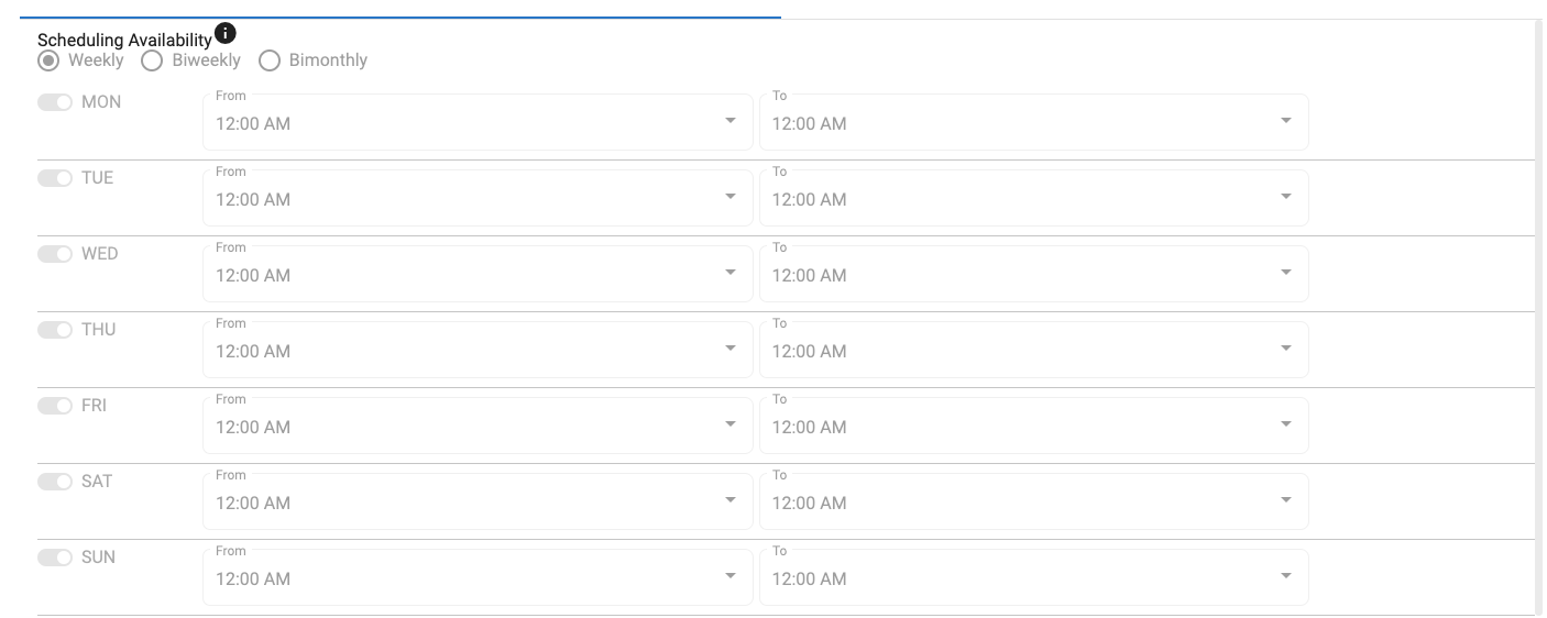 Breaks down schedule availability by day and working time block. Recurrence is set via radio button and currently supports weekly, Biweekly, and Bimonthly.