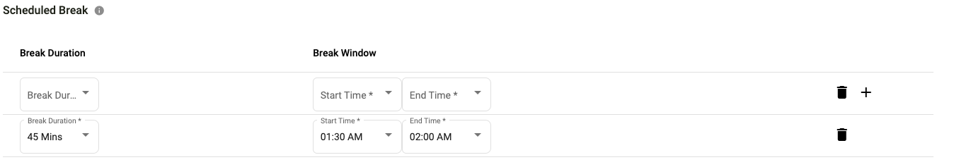 A window of time that a specific break can be scheduled. The implementation supports dynamic durations of breaks over a period of time. The break configuration will be evaluated on every new schedule run and will apply breaks based on forecasted volume. Breaks are prioritized such that agents are guaranteed to receive a break but that might create a scheduling gap. At which time, an agent required placeholder will be generated.